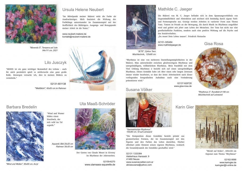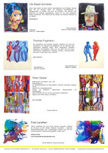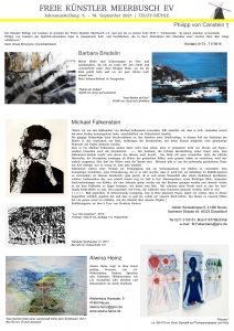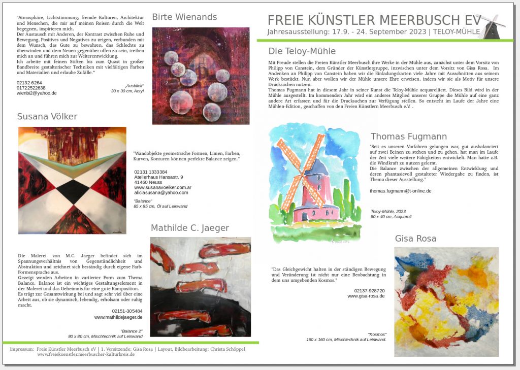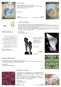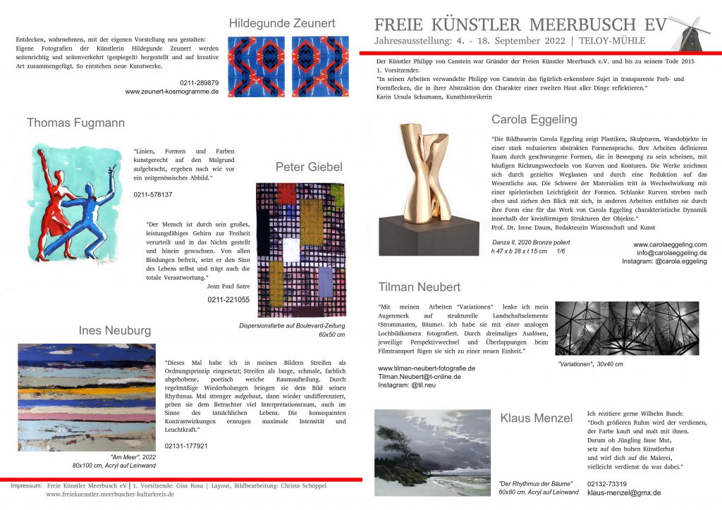 Seit 2015 erstellen wir jedes Jahr zur Ausstellung in der Teloy-Mühle ein Hand-out mit Informationen und Bildern von Werken, für die Besucher zum Mitnehmen, für uns zur Dokumentation. Dieses Jahr sind meist zwei Werke der Ausstellenden dargestellt, im Format DIN A3.