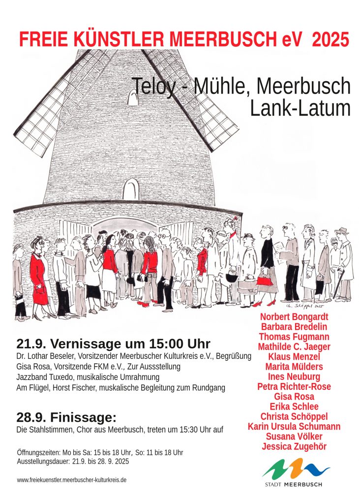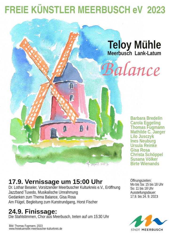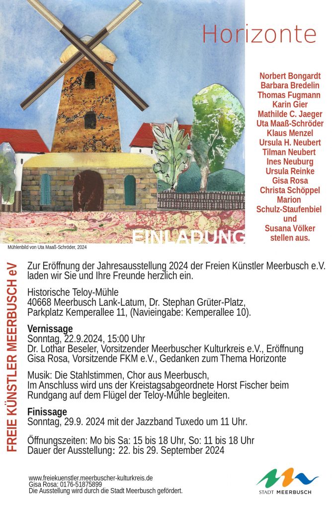 Mit Freude stellen die Freien Künstler Meerbusch ihre Werke in der Mühle aus, zunächst unter dem Vorsitz von Philipp von Canstein, dem Gründer der Künstlergruppe, inzwischen unter dem Vorsitz von Gisa Rosa.  Im  Andenken an Philipp von Canstein haben wir die Einladungskarten viele Jahre mit Ausschnitten aus seinem Werk bestückt. Nun aber wollen wir der Mühle unsere Ehre erweisen, indem wir sie als Motiv für unsere Drucksachen nutzen.  Thomas Fugmann hat in diesem Jahr in seiner Kunst die Teloy-Mühle acquarelliert. Dieses Bild wird in der Mühle ausgestellt. Im kommenden Jahr wird ein anderes Mitglied unserer Gruppe die Mühle auf eine ganz andere Art erfassen und für die Drucksachen zur Verfügung stellen. So entsteht im Laufe der Jahre eine Mühlen-Edition, geschaffen von den Freien Künstlern Meerbusch e.V. .